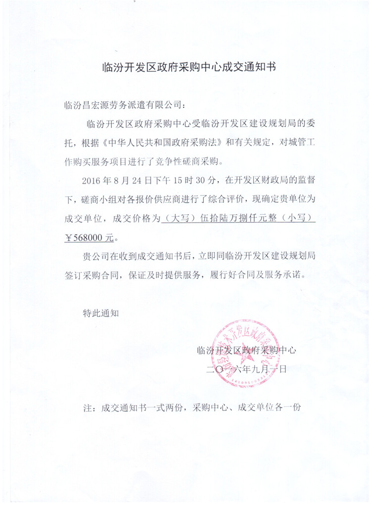 熱烈祝賀!臨汾昌宏源勞務派遣有限公司2016年8月24日在臨汾開發(fā)區(qū)建設規(guī)劃局服務項目中成功中標。